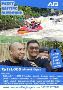 kami adalah Event Organizer kegiatan arung jeram atau rafting di Bogor yang bekerjasama dengan 5 Vendor Rafting di Bogor, artinya kami menawarkan paket rafting di bogor dengan banyak pilihan lokasi dan pilihan fasilitas dengan tapi dengan harga yang sama.